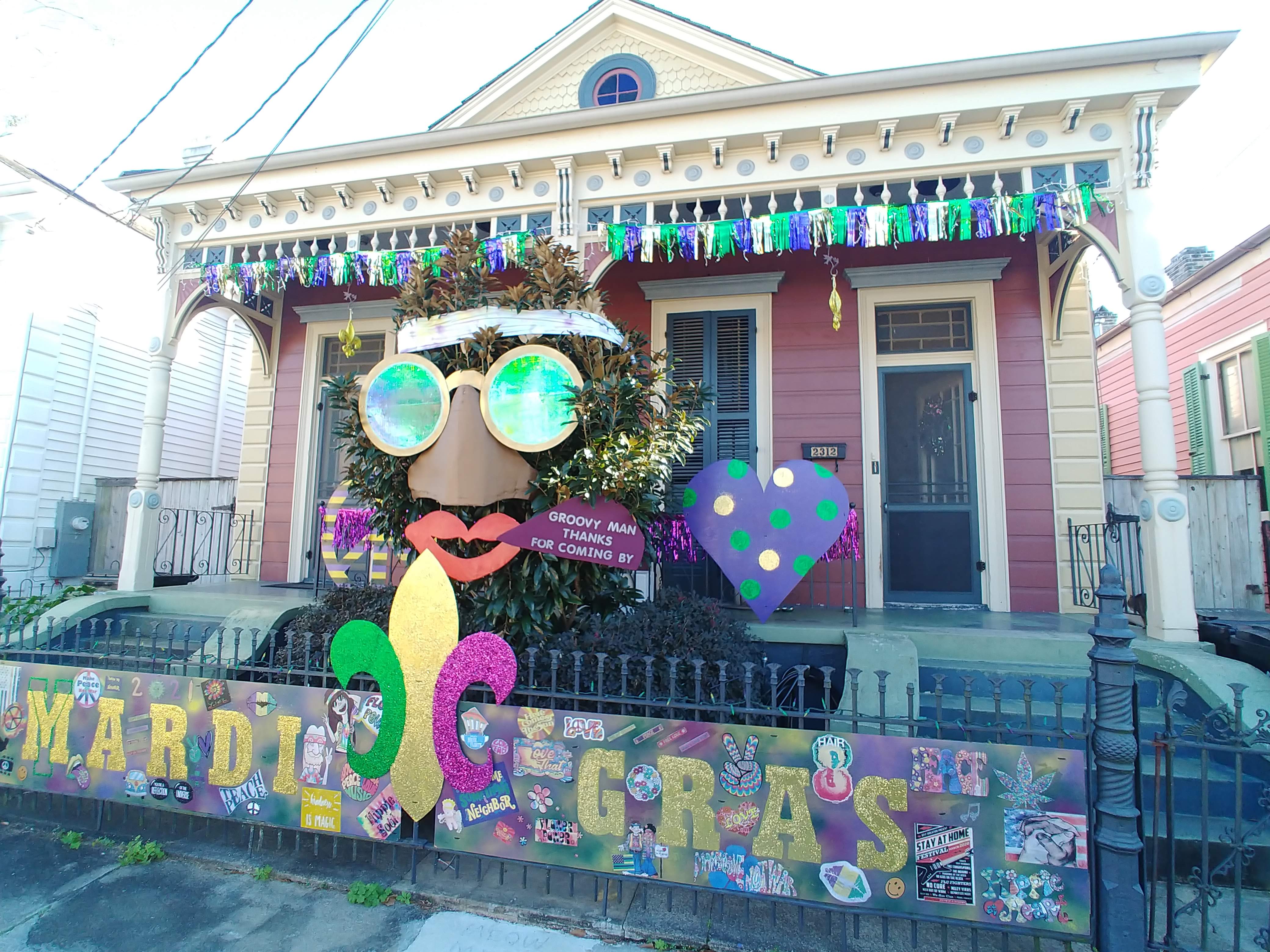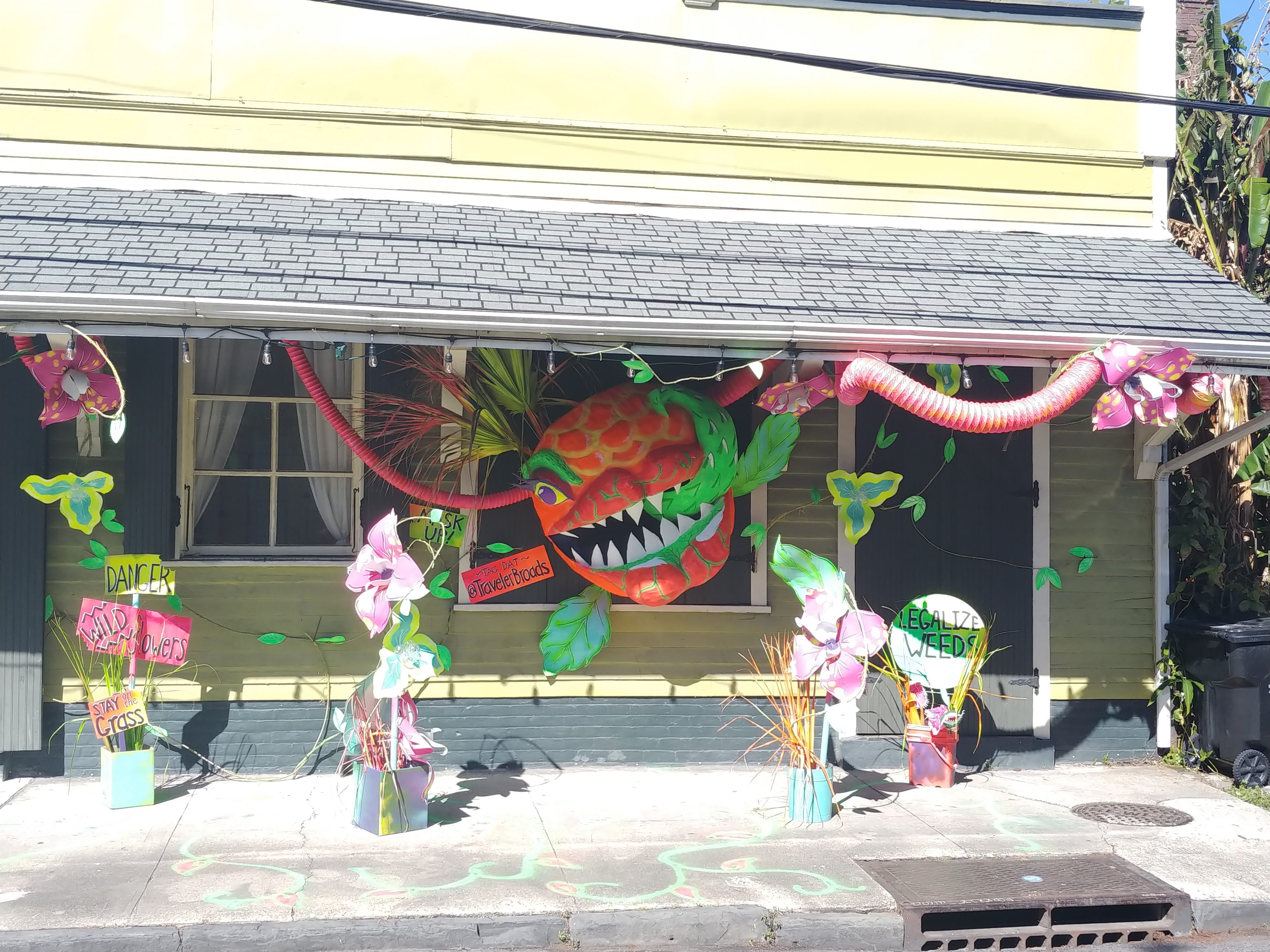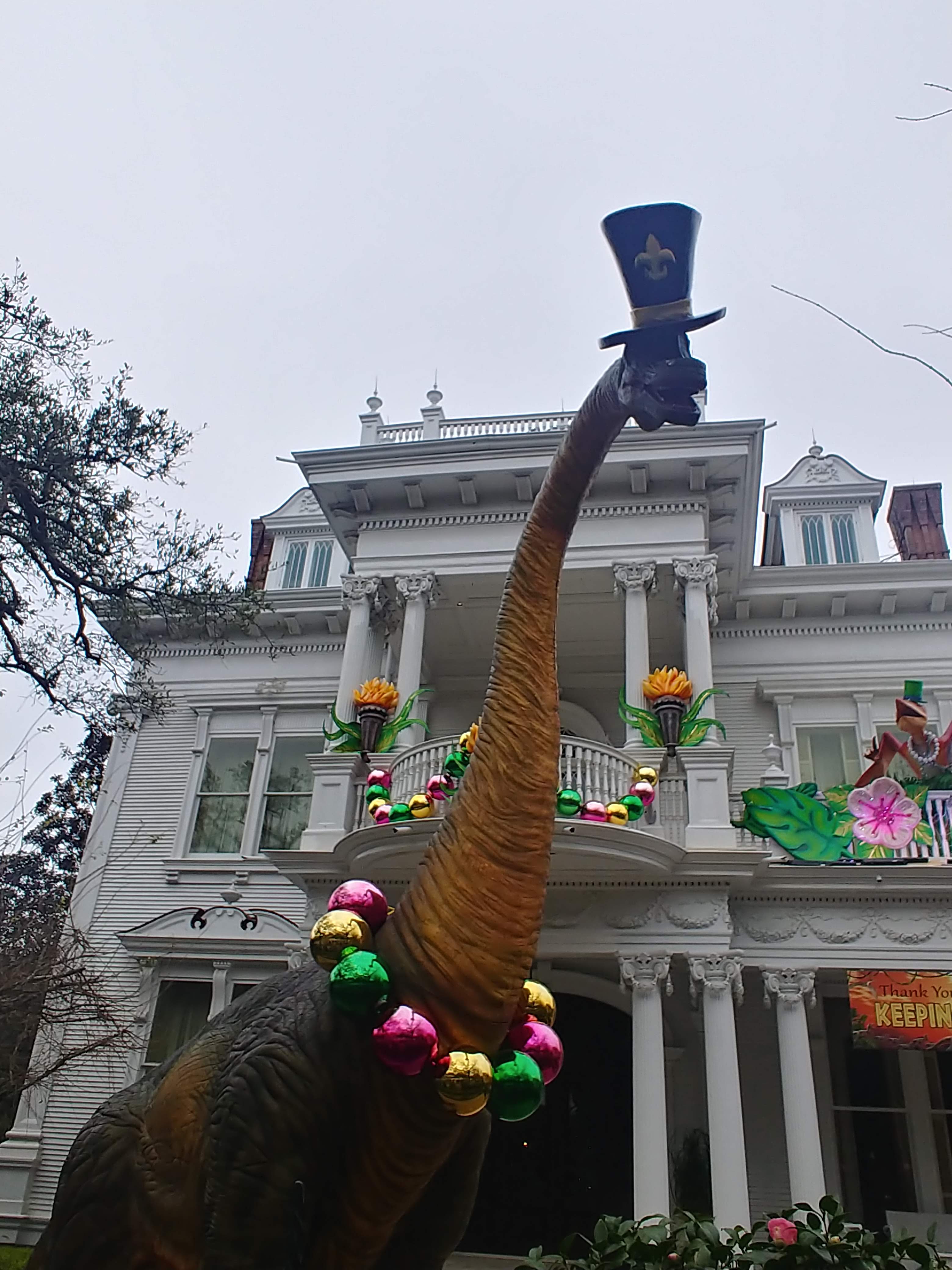 The phenomenon was dubbed Yardi Gras. It was a collaborative middle finger to the bitter disappointment that Mardi Gras as we know and adore it was not to be. Thousands of residents city wide went to extraordinary effort and expense to decorate the facades of their homes and front yards in the spirit and style of our longed-for friend in absentia, the parade float. The most extravagant and grandiose of all house floats could be found Uptown, along the oak tree-lined opulence that is St. Charles Avenue. Whether we’re talking about a life size Brachiosaurus, a menagerie of circus animals or a gargantuan cast of local music legend Dr. John, some of these enthusiasts were not playing around, and there were instances where cranes had to be involved in assembly. Yardi Gras became a weapon of choice for revellers in the battle against this holiday becoming a collective navel-gazing exercise and stopped some of us from falling into the chasm of a wound left in our glitter-dusted hearts. Parents with gasping kids on shoulders strolled along the Avenue, and while the rubbernecking and subsequent traffic might have caused a barely suppressed meltdown here or there, the peaceful energy of community was palpable even if it looked and sounded almost unrecognisable from the norm. And while the economic impacts of this year that wasn’t will be felt for who knows how long, Yardi Gras at least provided artists who would normally be working at warp speed to decorate parade floats, with a much-needed chance for expression, creativity and earning income.
