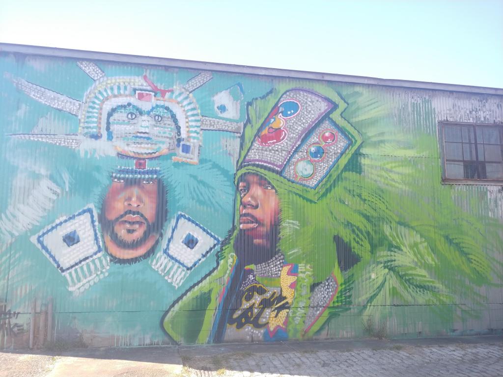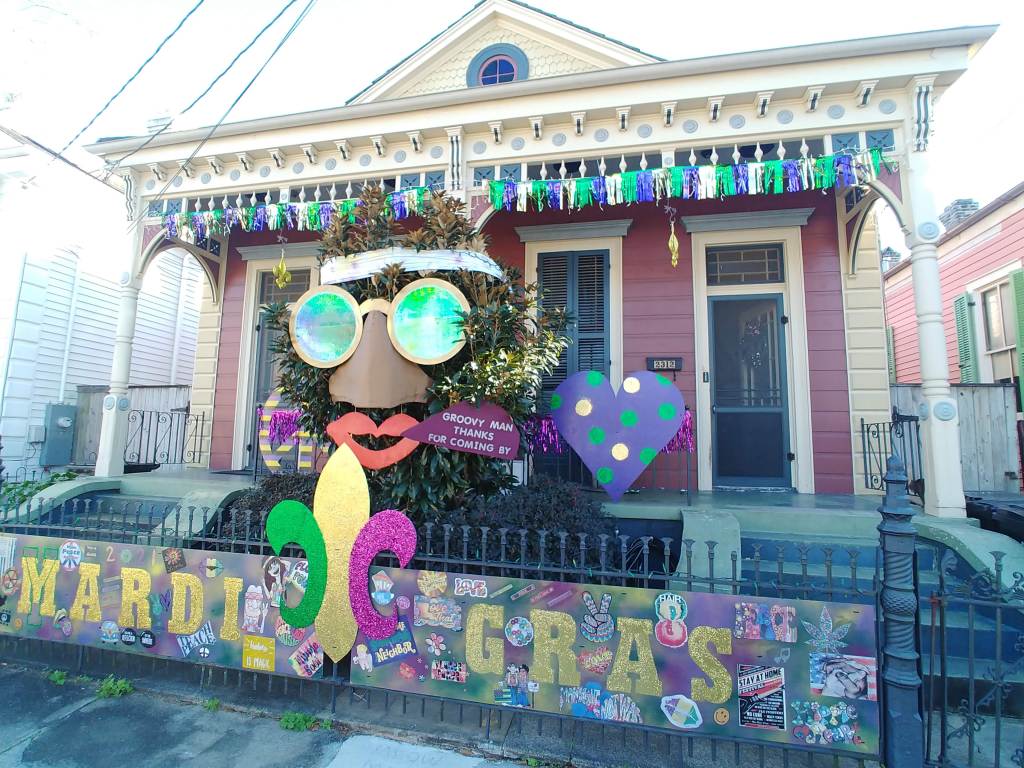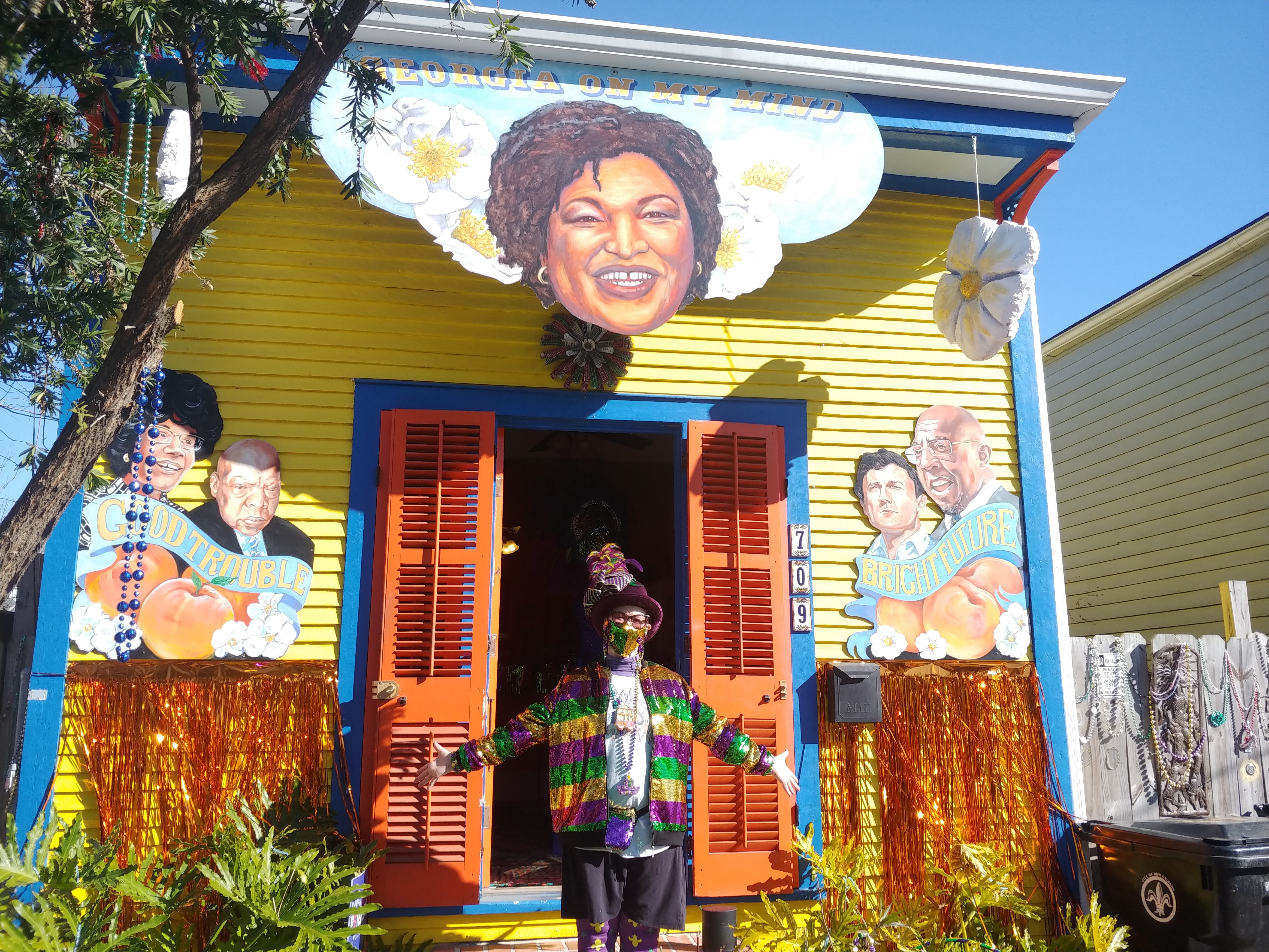 Across town in Uptown’s less ostentatious cousin, the Miss Congeniality award was handed out, to the house floats of the beautiful Bywater neighbourhood. On a Sunday afternoon with spirit-lifting blue skies, my dear and masked friend Merry and I wandered the streets and marvelled in a sense of positivity you could physically feel. The warmth that was barrelling through me just from being outside and hearing a quartet rehearsing in a front yard was not something I had expected to feel. Our agenda-less itinerary took us past murals and outdoor dining as we criss crossed our way along to bask in the famed sunny side of the street. We distanced at a garage sale on a sidewalk and at a quick stop at Pepp’s, a watering hole where furry canine friends are in charge, and is named after the pup in residence. But the Emerald City at the end of this yellow brick road was the house float dedicated to past and present trailblazers of Georgia who were pivotal in turning the house, the senate and the Presidential election the way of the blue after a red dominance in the state since the post-Clinton era. The relentless dedication of these extraordinary people is the very definition of making a difference and their efforts are an inspirational and indisputable chapter of history when the stakes were unbearably high. As sequin speckled homeowner Carol explained, while she’s not from Georgia, decorating her abode was a mark of gratitude and a way to support local artists.