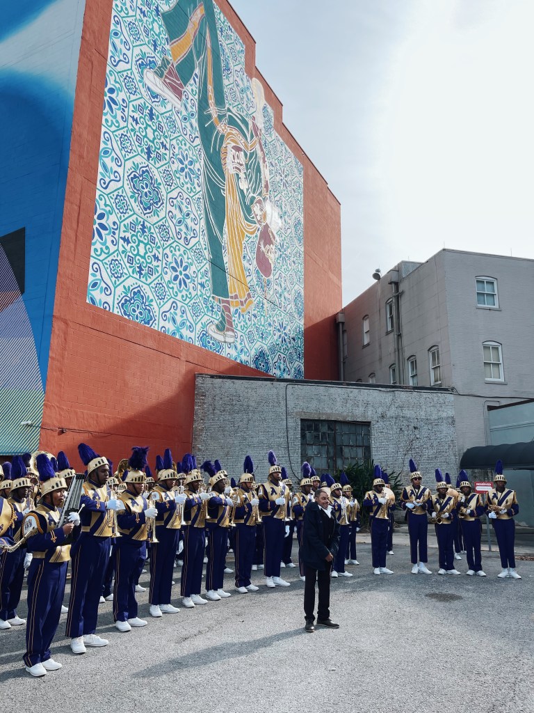 New Orleans doesn’t do any celebration by half and this spectacle was no exception. After words from the artist and other dignitaries who worked to bring this genius to fruition, we added some extra glitter to feathers. Given the mural is a nod to one of the most respected posts of any parade, it was only fitting that we experienced the mural to the soundtrack of one of the most skilled and revered marching bands in the United States, the St Augustine Marching 100. Parading is serious business in New Orleans and the Purple Knights are the benchmark to which most others aspire. Among its many accolades, The Grammy Award winning group has performed in the Macy’s Thanksgiving Day Parade, for five consecutive U.S. Presidents, in numerous NFL and NBA games and been featured in dozens of news specials and documentaries including the 2021 60 Minutes story: Best Band in the Land. And all this from high school kids. St. Augs were in all their splendour on this auspicious day and their synergy with the majesty of the mural you could have only previously dreamed of.